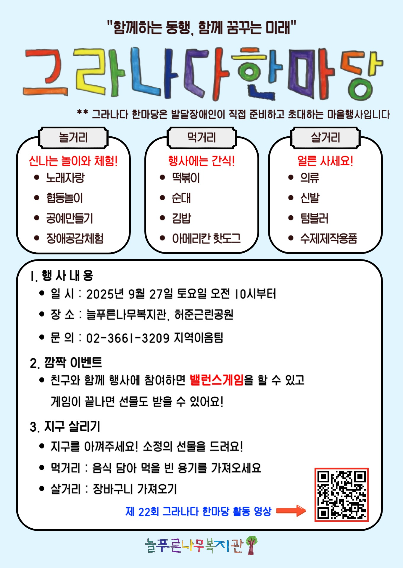 올해로 23회째를 맞는 그라나다 한마당은 발달장애인이 직접 추진위원과 진행자로 참여하여 축제를 기획하고 운영하는 것이 가장 큰 특징입니다. 이를 통해 지역사회와의 자연스러운 교류를 촉진하고 발달장애 친화적인 환경을 조성하는 것을 목표로 합니다.