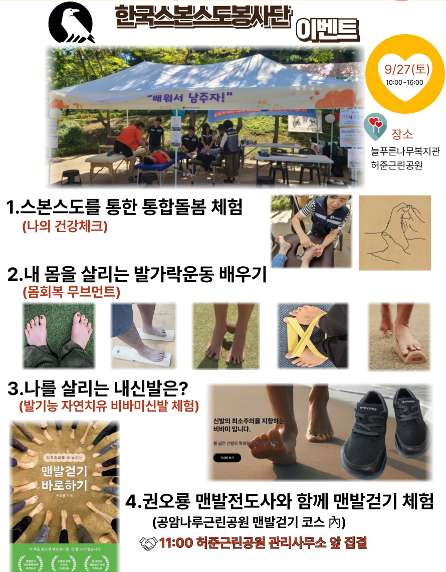 한국스본스도연구회 스본스도봉사단은 이번 축제에서 ‘몸의 자연치유력 회복’이라는 스본스도의 핵심 원리를 누구나 쉽게 체험할 수 있는 네 가지 특별 프로그램을 운영합니다.